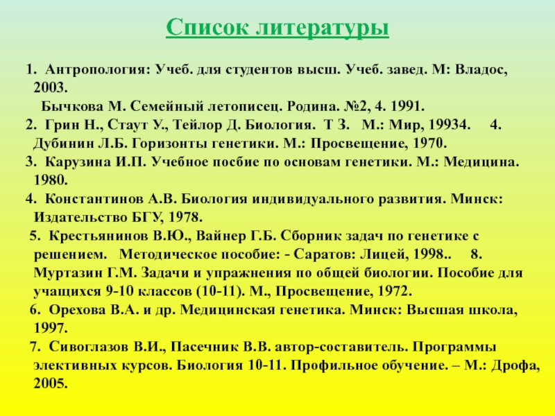 2. Грин Н., Стаут У., Тейлор Д. Биология. Т З. М.: Мир, 19934. 4. Дубинин Л.Б. Горизонты генетики. М.: Просвещение, 1970.