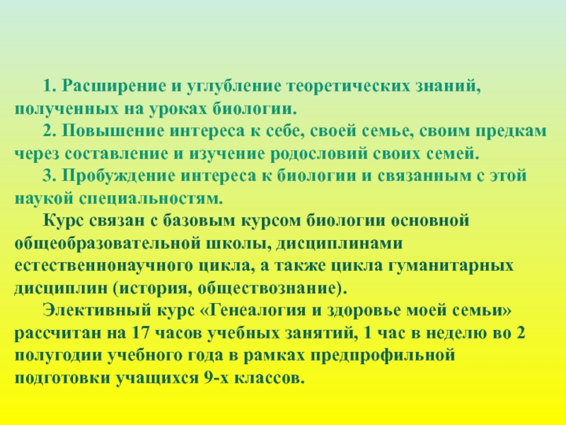Элективный курс «Генеалогия и здоровье моей семьи» рассчитан на 17 часов учебных занятий, 1 час в неделю во 2 полугодии учебного года в рамках предпрофильной подготовки учащихся 9-х классов.