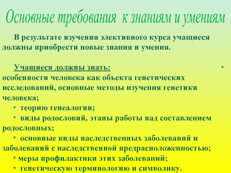 Учащиеся должны знать: ∙ особенности человека как объекта генетических исследований, основные методы изучения генетики человека; ∙ теорию генеалогии; ∙ виды родословий, этапы работы над составлением родословных; ∙ основные виды наследственных заболеваний и заболеваний с наследственной предрасположенностью; ∙ меры профилактики этих заболеваний; ∙ генетическую терминологию и символику.