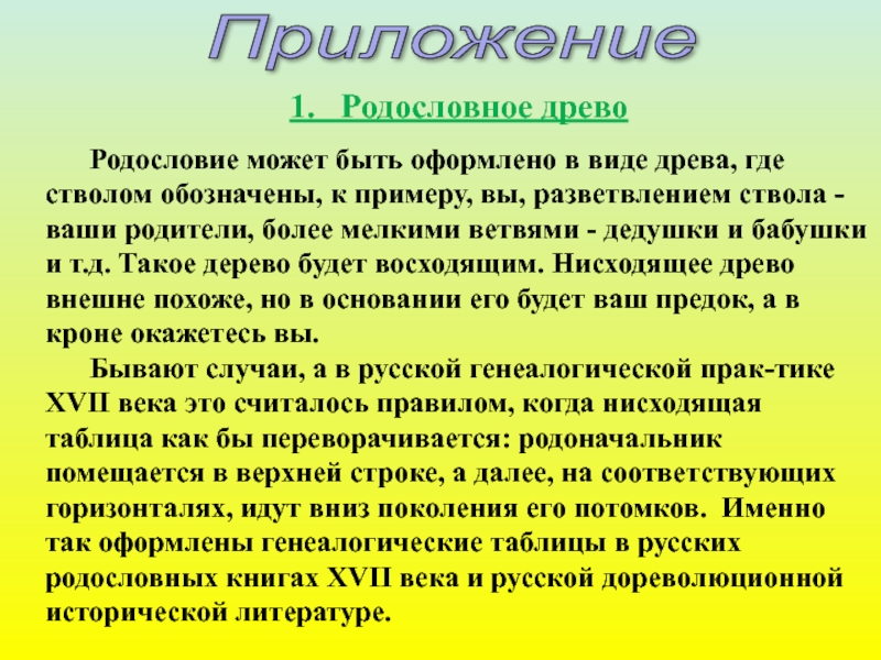 в виде древа, где стволом обозначены, к примеру, вы, разветвлением ствола - ваши родители, более мелкими ветвями - дедушки и бабушки и т.д. Такое дерево будет восходящим. Нисходящее древо внешне похоже, но в основании его будет ваш предок, а в кроне окажетесь вы. Бывают случаи, а в русской генеалогической прак-тике XVII века это считалось правилом, когда нисходящая таблица как бы переворачивается: родоначальник помещается в верхней строке, а далее, на соответствующих горизонталях, идут вниз поколения его потомков. Именно так оформлены генеалогические таблицы в русских родословных книгах XVII века и русской дореволюционной исторической литературе.