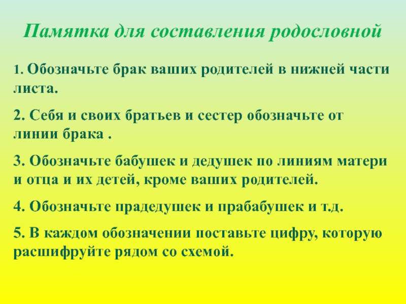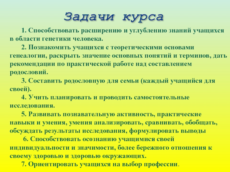 генетики человека. 2. Познакомить учащихся с теоретическими основами генеалогии, раскрыть значение основных понятий и терминов, дать рекомендации по практической работе над составлением родословий. 3. Составить родословную для семьи (каждый учащийся для своей). 4. Учить планировать и проводить самостоятельные исследования. 5. Развивать познавательную активность, практические навыки и умения, умения анализировать, сравнивать, обобщать, обсуждать результаты исследования, формулировать выводы 6. Способствовать осознанию учащимися своей индивидуальности и значимости, более бережного отношения к своему здоровью и здоровью окружающих. 7. Ориентировать учащихся на выбор профессии.