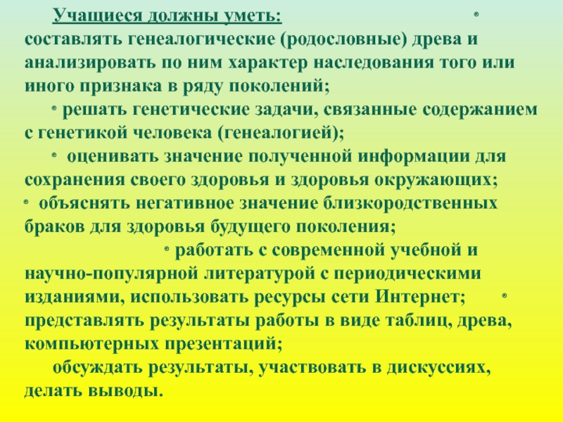∙ составлять генеалогические (родословные) древа и анализировать по ним характер наследования того или иного признака в ряду поколений; ∙ решать генетические задачи, связанные содержанием с генетикой человека (генеалогией); ∙ оценивать значение полученной информации для сохранения своего здоровья и здоровья окружающих; ∙ объяснять негативное значение близкородственных браков для здоровья будущего поколения; ∙ работать с современной учебной и научно-популярной литературой с периодическими изданиями, использовать ресурсы сети Интернет; ∙ представлять результаты работы в виде таблиц, древа, компьютерных презентаций; обсуждать результаты, участвовать в дискуссиях, делать выводы.