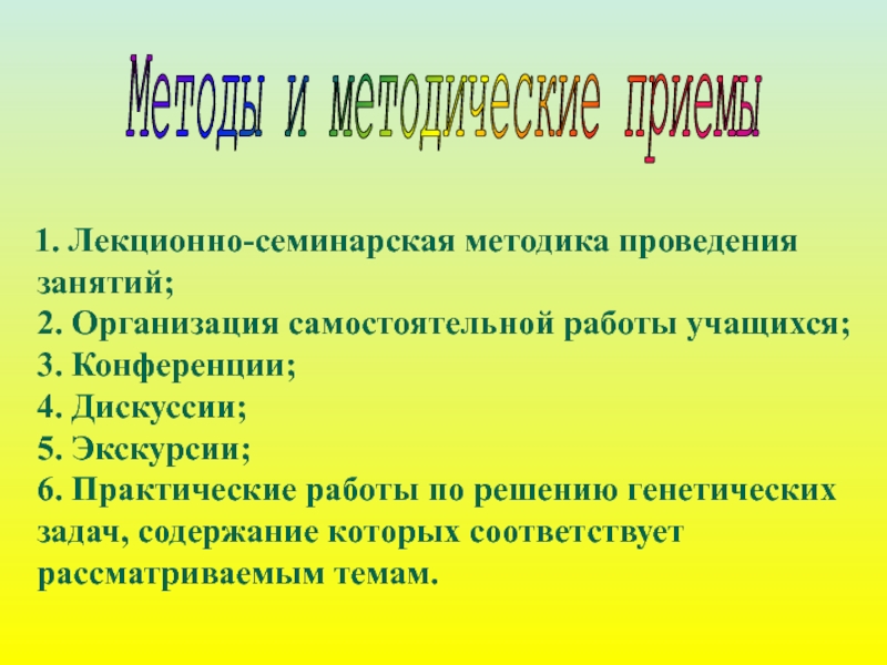 занятий; 2. Организация самостоятельной работы учащихся; 3. Конференции; 4. Дискуссии; 5. Экскурсии; 6. Практические работы по решению генетических задач, содержание которых соответствует рассматриваемым темам.