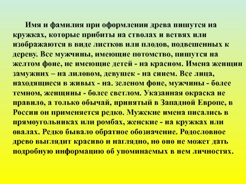 на стволах и ветвях или изображаются в виде листков или плодов, подвешенных к дереву. Все мужчины, имеющие потомство, пишутся на желтом фоне, не имеющие детей - на красном. Имена женщин замужних – на лиловом, девушек - на синем. Все лица, находящиеся в живых - на. зеленом фоне, мужчины - более темном, женщины - более светлом. Указанная окраска не правило, а только обычай, принятый в Западной Европе, в России он применяется редко. Мужские имена писались в прямоугольниках или ромбах, женские - на кружках или овалах. Редко бывало обратное обозначение. Родословное древо выглядит красиво и наглядно, но оно не может дать подробную информацию об упоминаемых в нем личностях.
