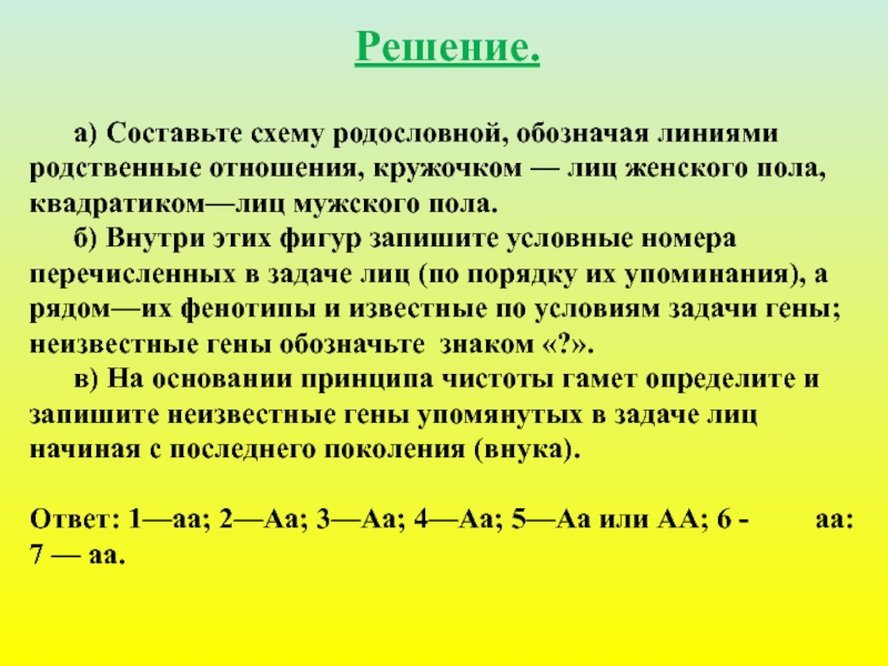 Ответ: 1—аа; 2—Аа; 3—Аа; 4—Аа; 5—Аа или АА; 6 - аа: 7 — аа.