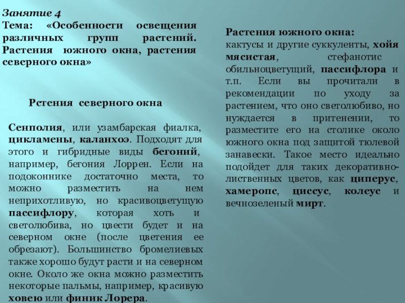 Сенполия, или узамбарская фиалка, цикламены, каланхоэ. Подходят для этого и гибридные виды бегоний, например, бегония Лоррен. Если на подоконнике достаточно места, то можно разместить на нем неприхотливую, но красивоцветущую пассифлору, которая хоть и светолюбива, но цвести будет и на северном окне (после цветения ее обрезают). Большинство бромелиевых также хорошо будут расти и на северном окне. Около же окна можно разместить некоторые пальмы, например, красивую ховею или финик Лорера.