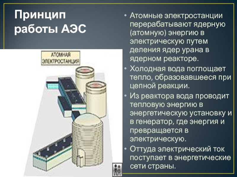 Принцип работы АЭСАтомные электростанции перерабатывают ядерную (атомную) энергию в электрическую путем деления ядер урана в ядерном реакторе.