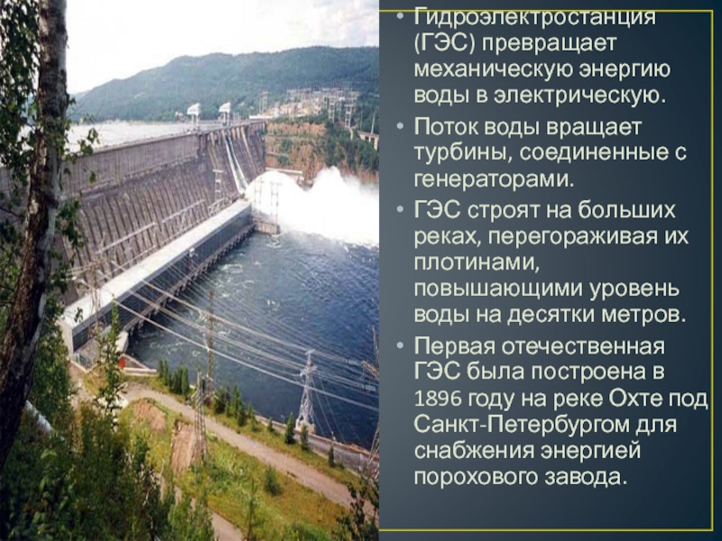 ГЭСГидроэлектростанция (ГЭС) превращает механическую энергию воды в электрическую. Поток воды вращает турбины, соединенные с генераторами.ГЭС строят на
