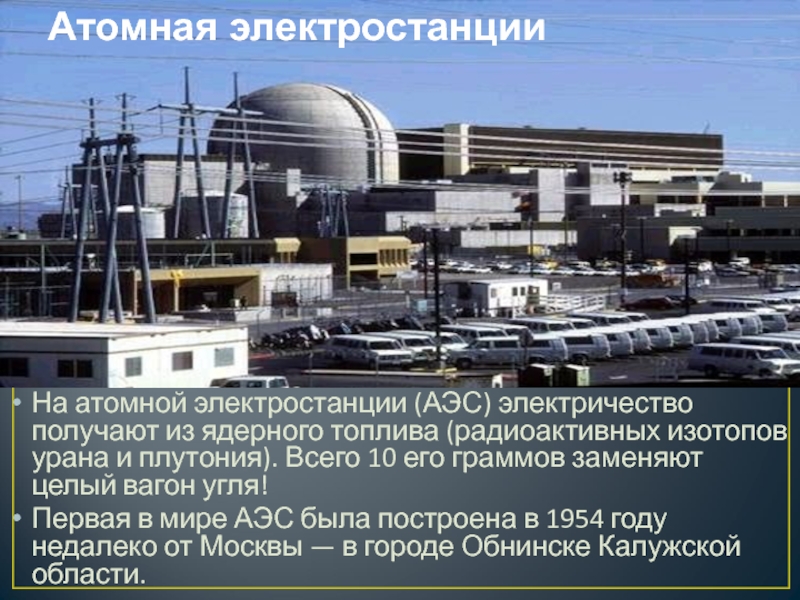 Атомная электростанцииНа атомной электростанции (АЭС) электричество получают из ядерного топлива (радиоактивных изотопов урана и плутония). Всего 10