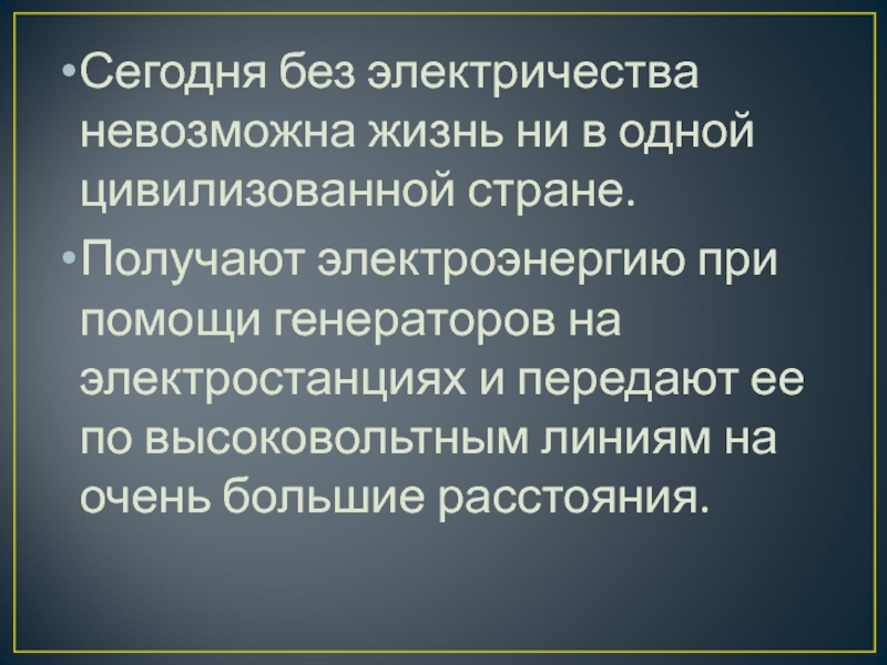 электроэнергию при помощи генераторов на электростанциях и передают ее по высоковольтным линиям на очень большие расстояния.