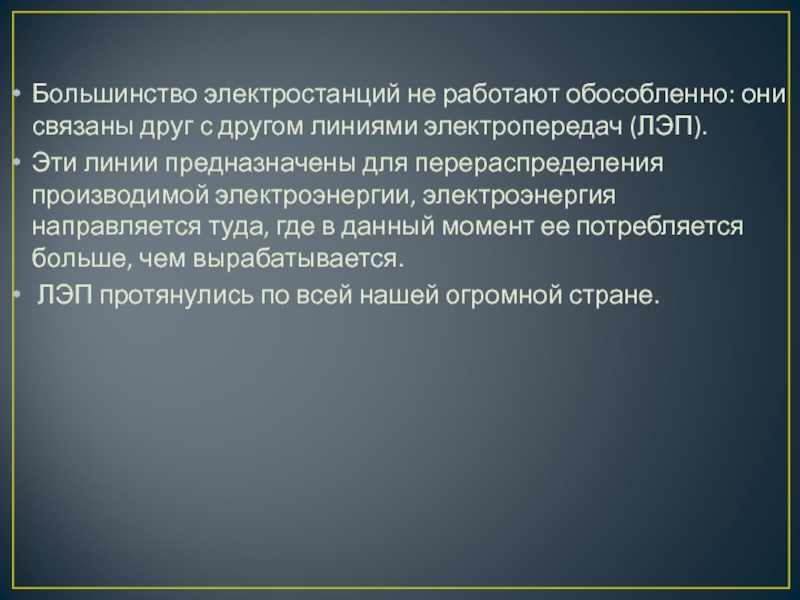 Слайд 14Большинство электростанций не работают обособленно: они связаны друг с другом линиями