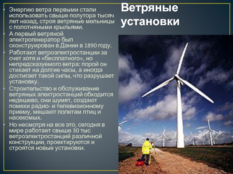 Ветряные установкиЭнергию ветра первыми стали использовать свыше полутора тысяч лет назад, строя ветряные мельницы с полотняными крыльями.А