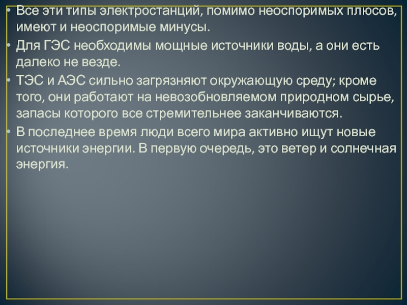 Слайд 9Все эти типы электростанций, помимо неоспоримых плюсов, имеют и неоспоримые минусы.