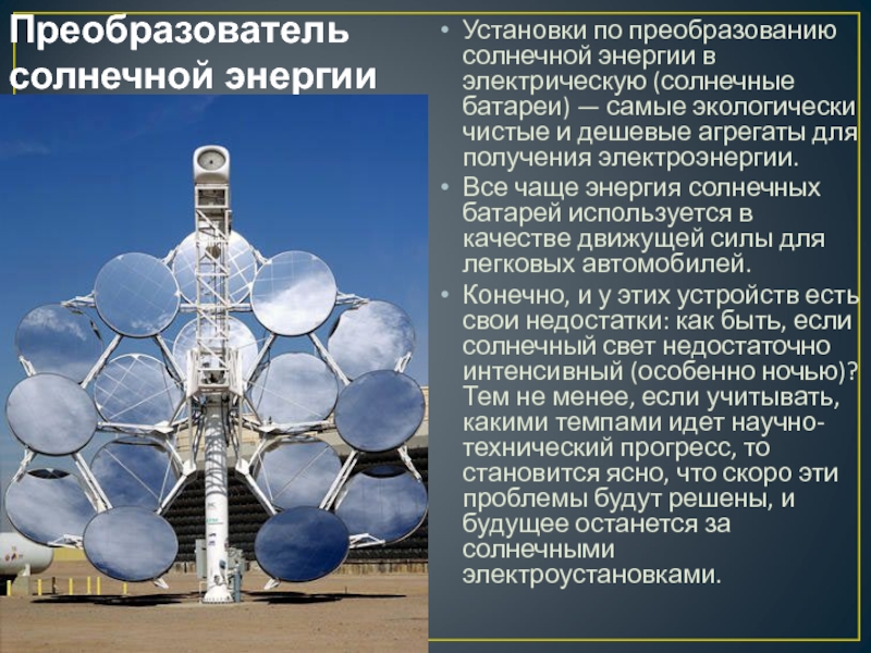 Преобразователь солнечной энергииУстановки по преобразованию солнечной энергии в электрическую (солнечные батареи) — самые экологически чистые и дешевые