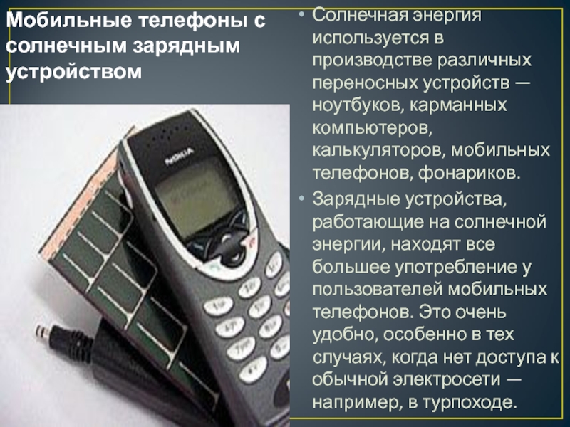 Мобильные телефоны с солнечным зарядным устройствомСолнечная энергия используется в производстве различных переносных устройств — ноутбуков, карманных компьютеров,