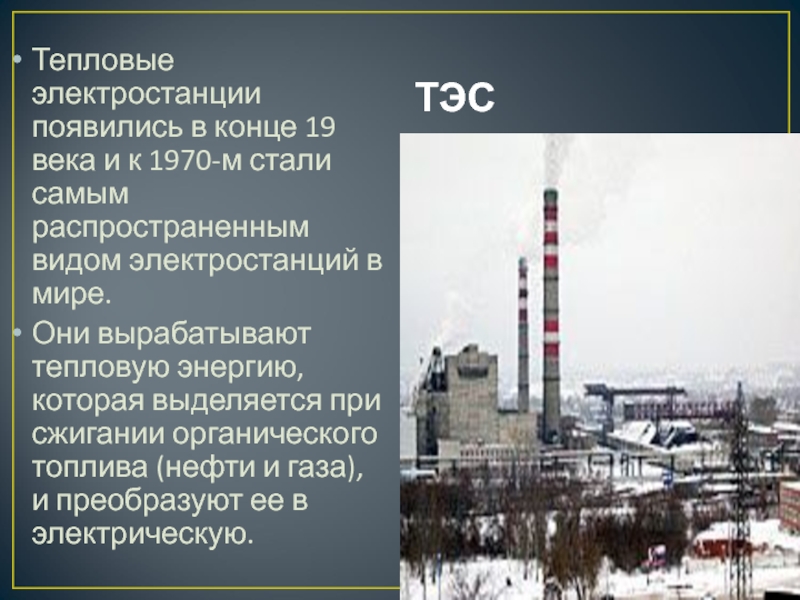 ТЭСТепловые электростанции появились в конце 19 века и к 1970-м стали самым распространенным видом электростанций в мире.