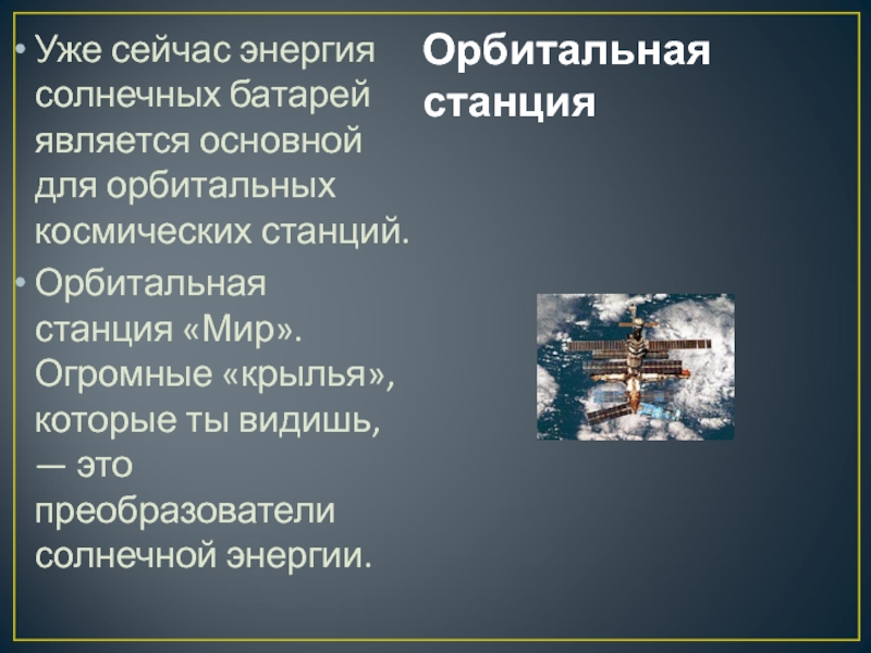 Орбитальная станцияУже сейчас энергия солнечных батарей является основной для орбитальных космических станций. Орбитальная станция «Мир». Огромные «крылья»,