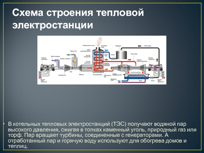 высокого давления, сжигая в топках каменный уголь, природный газ или торф. Пар вращает турбины, соединенные с генераторами. А отработанный пар и горячую воду используют для обогрева домов и теплиц.