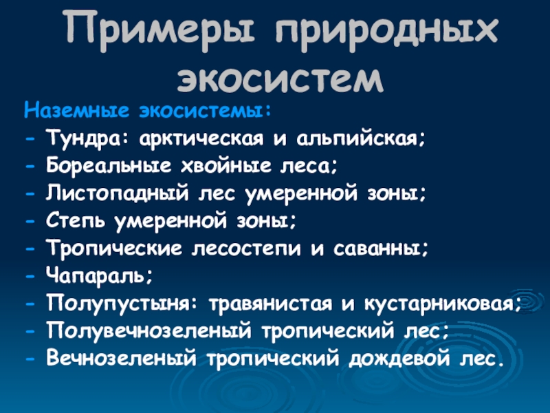 Примеры природных экосистемНаземные экосистемы:- Тундра: арктическая и альпийская;- Бореальные хвойные леса;- Листопадный лес умеренной зоны;- Степь умеренной
