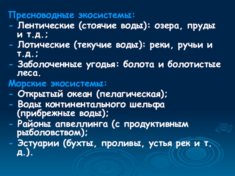 Пресноводные экосистемы:- Лентические (стоячие воды): озера, пруды и т.д.;- Лотические (текучие воды): реки, ручьи и т.д.;- Заболоченные