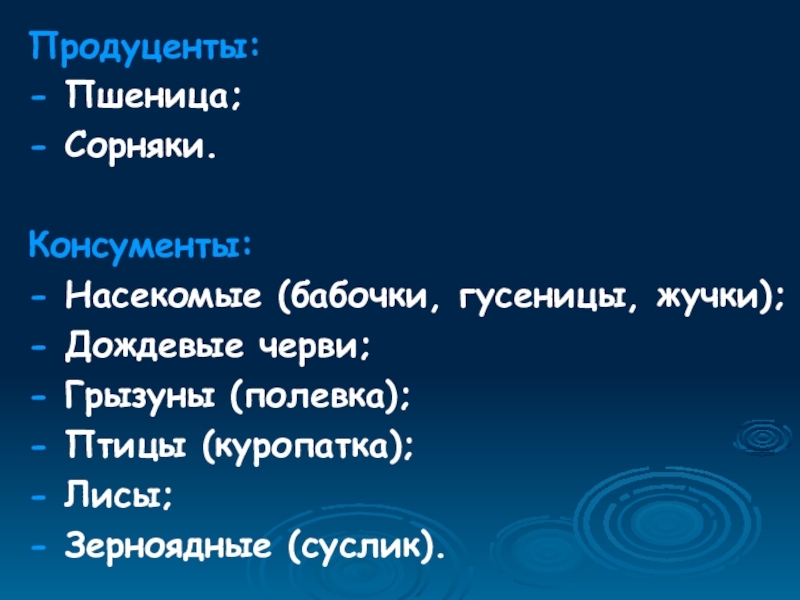 Продуценты:- Пшеница;- Сорняки.Консументы:- Насекомые (бабочки, гусеницы, жучки);- Дождевые черви;- Грызуны (полевка);- Птицы (куропатка);- Лисы;- Зерноядные (суслик).