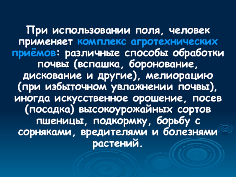 При использовании поля, человек применяет комплекс агротехнических приёмов: различные способы обработки