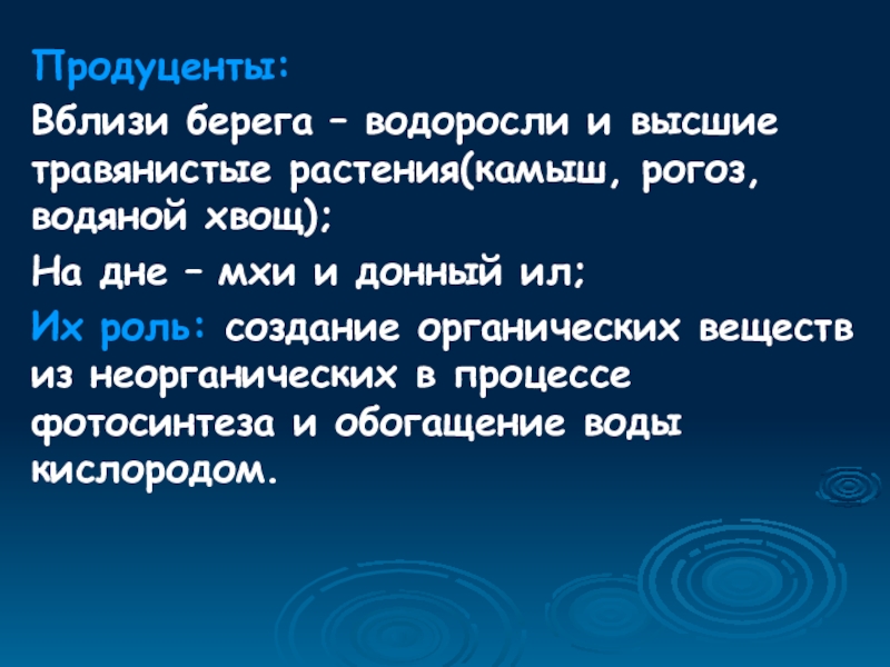 Продуценты:Вблизи берега – водоросли и высшие травянистые растения(камыш, рогоз, водяной хвощ);На дне – мхи и донный ил;Их
