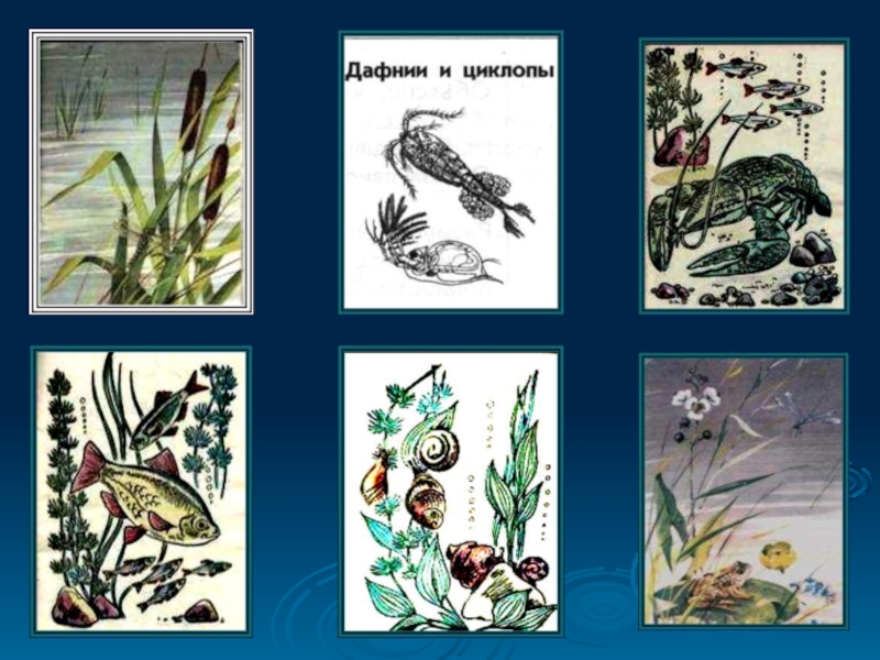 ракообразные (дафнии, циклопы), рачки, насекомые, черви, амфибии (лягушки, тритоны) рыбы (щука, окунь – хищные, карась - травоядные), млекопитающие (выхухоль, бобры, выдры).