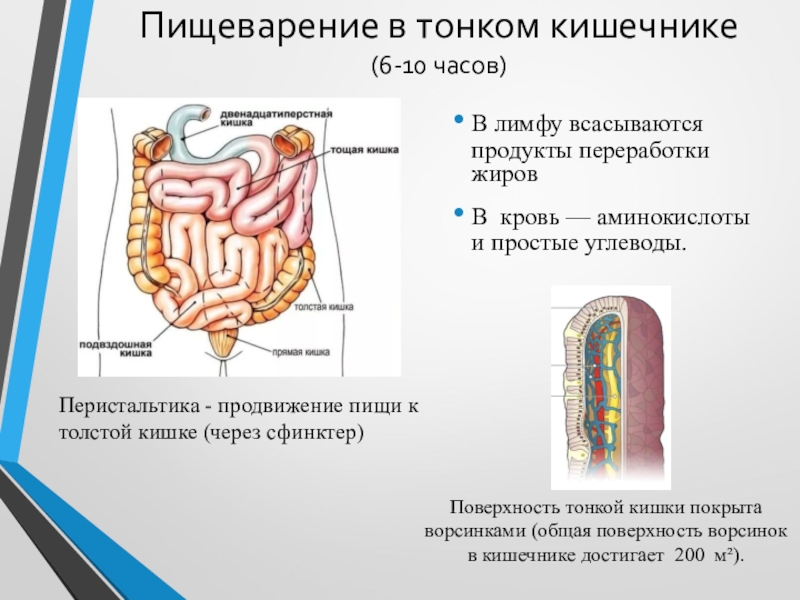 Поверхность тонкой кишки покрыта ворсинками (общая поверхность ворсинок в кишечнике достигает 200 м²).