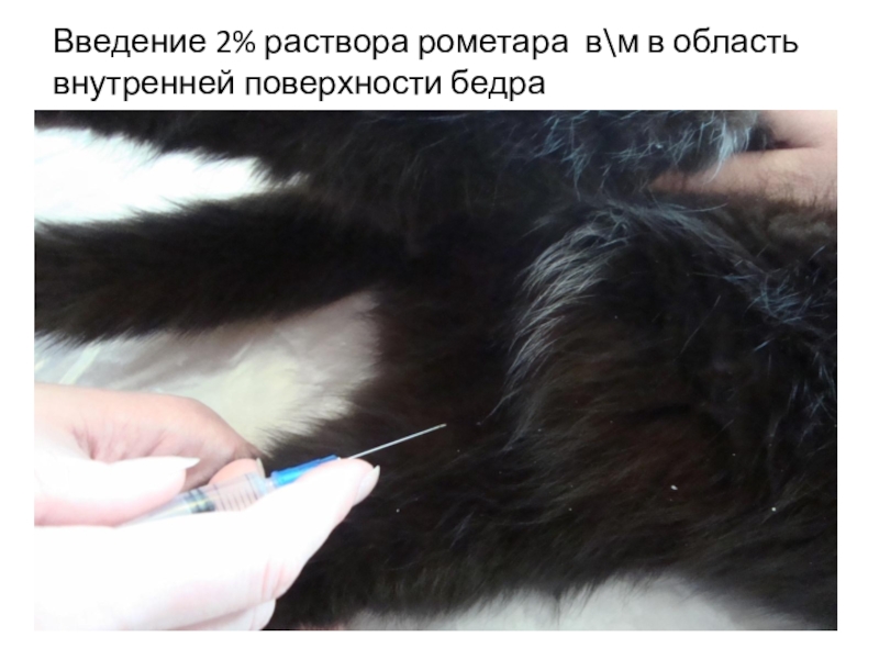 Слайд 10Введение 2% раствора рометара в\м в область внутренней поверхности бедра