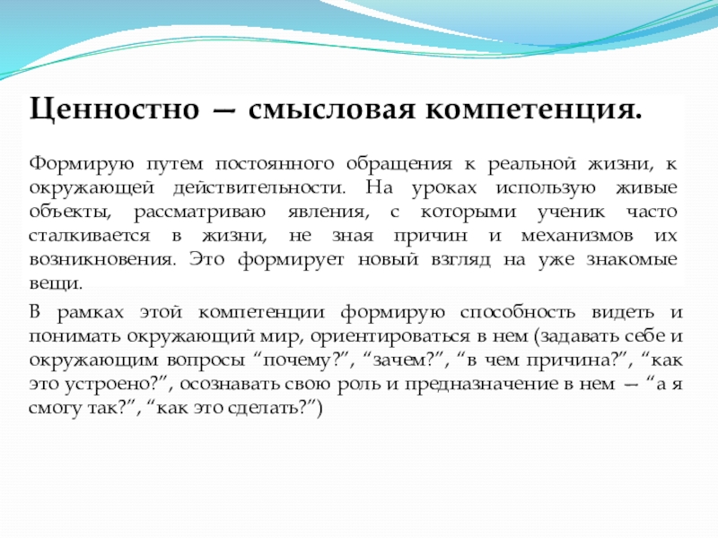В рамках этой компетенции формирую способность видеть и понимать окружающий мир, ориентироваться в нем (задавать себе и окружающим вопросы “почему?”, “зачем?”, “в чем причина?”, “как это устроено?”, осознавать свою роль и предназначение в нем — “а я смогу так?”, “как это сделать?”)
