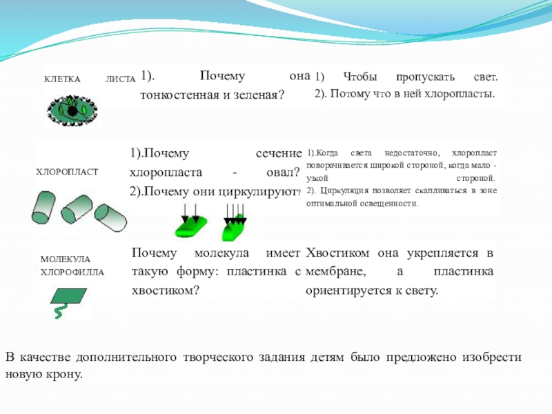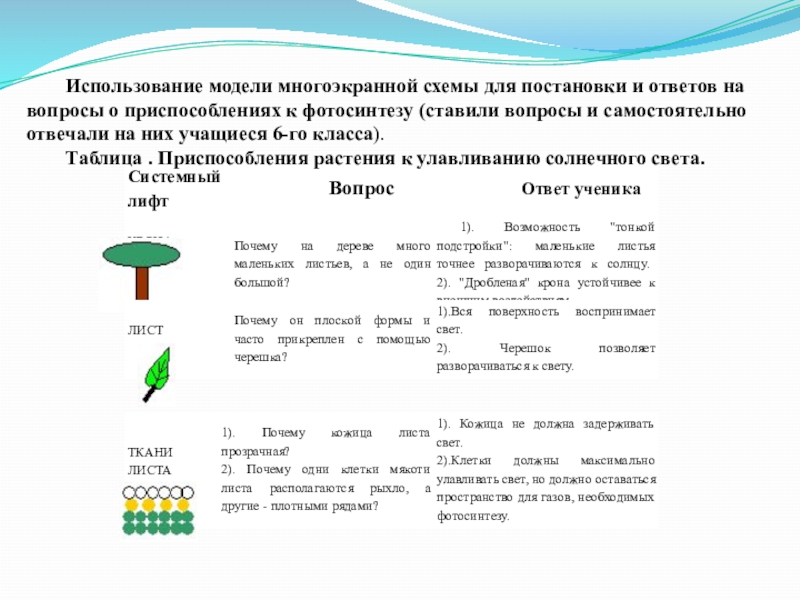 приспособлениях к фотосинтезу (ставили вопросы и самостоятельно отвечали на них учащиеся 6-го класса).