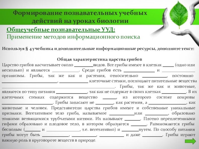 Царство грибов насчитывает около ________ видов. Все грибы имеют в клетках _____ (одно или несколько) и являются ____________. Среди грибов есть ______________ и _______________ организмы. Грибы, так же как и растения, относительно ___________, постоянно _________________________, _____________ клеточные стенки, поглощают питательные вещества ___________________________________________________. Грибы, так же как и животные, являются по типу питания ______________, так как не содержат в своих клетках ___________. В их клеточных стенках содержится вещество ______, из которого состоят покровы _______________________. Грибы запасают не ________, как растения, а _________________, как животные и человек. Представители царства грибов имеют и собственные уникальные признаки. Вегетативное тело гриба, называемое __________ или _________, образовано тонкими ветвящимися трубчатыми нитями. Их называют _______. Плотно переплетенными гифами образовано и плодовое тело, в котором образуются _______. Размножаются грибы бесполым (_______ и _______________, т.е. вегетативно) и _______ путем. По способу питания грибы могут быть ____________, ___________, ___________ и даже _________. Грибы играют важную роль в круговороте веществ в природе.