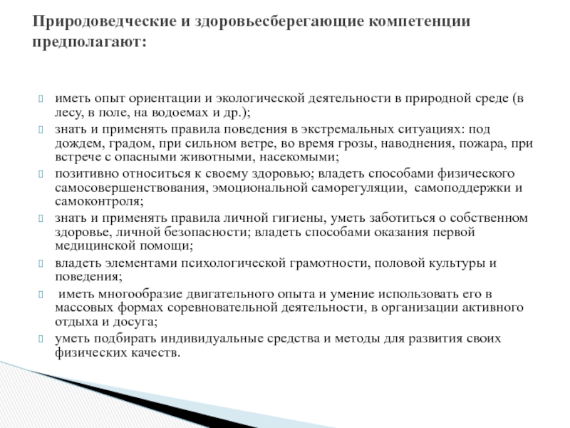 Природоведческие и здоровьесберегающие компетенции предполагают: