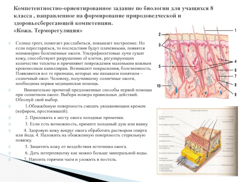 Внимательно прочитай предложенные способы первой помощи при солнечном ожоге. Выбери номера правильных действий. Обоснуй свой выбор.