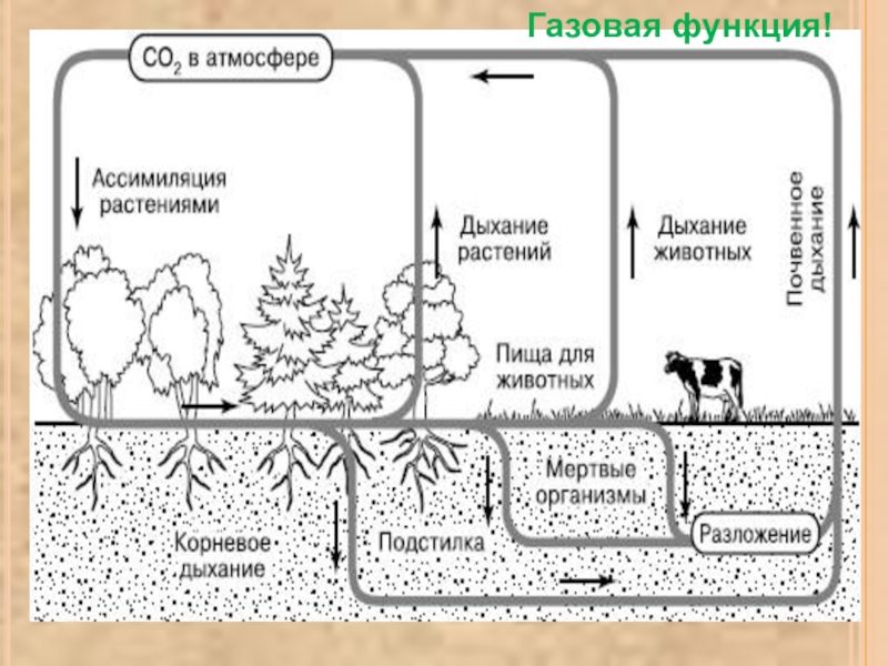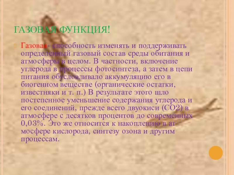 8. Геохимическая функция, при которой создаётся свободный кислород и переход его в озон; выделение свободного азота, сероводорода, метана и других газов при разложении живого вещества; поддержание на определённом уровне количества углекислого газа в атмосфере.
