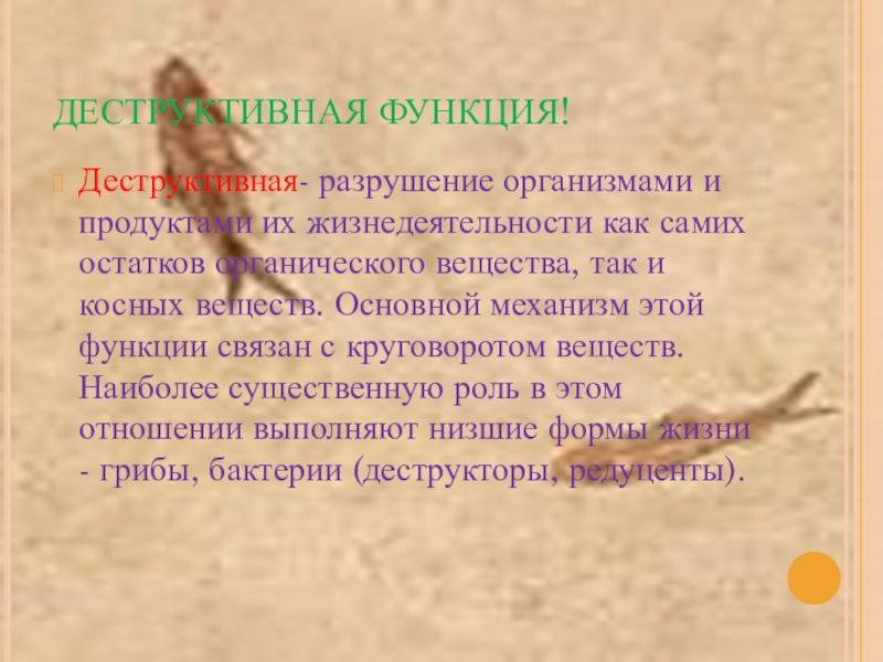 Деструктивная- разрушение организмами и продуктами их жизнедеятельности как самих остатков