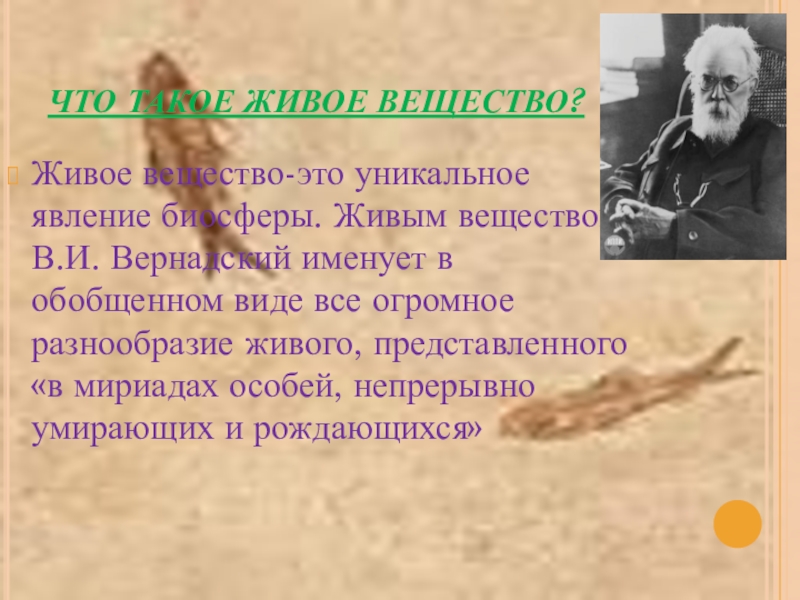 Вернадский именует в обобщенном виде все огромное разнообразие живого, представленного «в мириадах особей, непрерывно умирающих и рождающихся»
