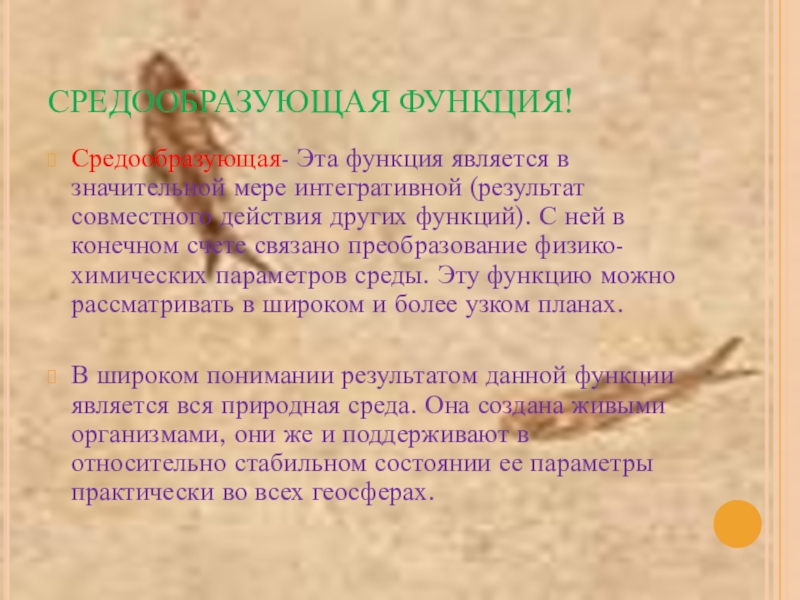 Средообразующая- Эта функция является в значительной мере интегративной (результат совместного