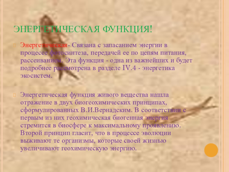 Энергетическая функция живого вещества нашла отражение в двух биогеохимических принципах, сформулированных В.И.Вернадским. В соответствии с первым из них геохимическая биогенная энергия стремится в биосфере к максимальному проявлению. Второй принцип гласит, что в процессе эволюции выживают те организмы, которые своей жизнью увеличивают геохимическую энергию.