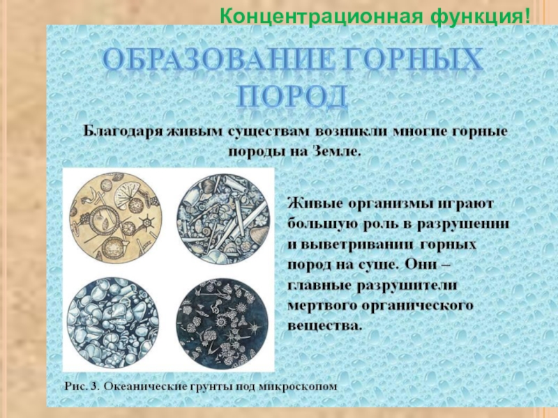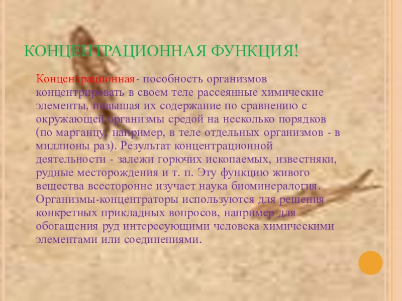 повышая их содержание по сравнению с окружающей организмы средой на несколько порядков (по марганцу, например, в теле отдельных организмов - в миллионы раз). Результат концентрационной деятельности - залежи горючих ископаемых, известняки, рудные месторождения и т. п. Эту функцию живого вещества всесторонне изучает наука биоминералогия. Организмы-концентраторы используются для решения конкретных прикладных вопросов, например для обогащения руд интересующими человека химическими элементами или соединениями.