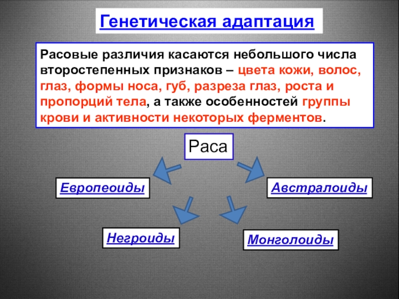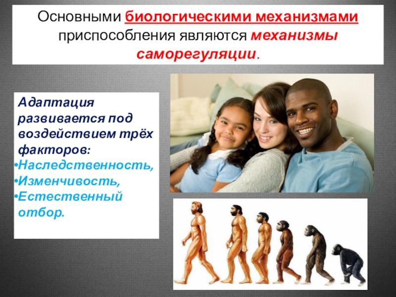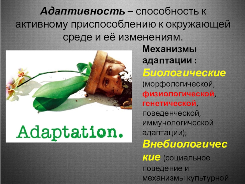 адаптации : Биологические (морфологической, физиологической, генетической, поведенческой, иммунологической адаптации);