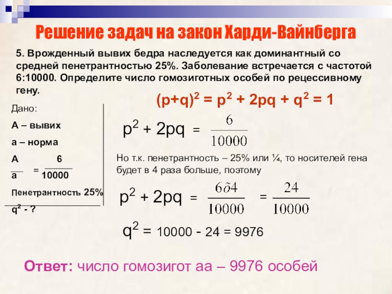 Но т.к. пенетрантность – 25% или ¼, то носителей гена будет в 4 раза больше, поэтому