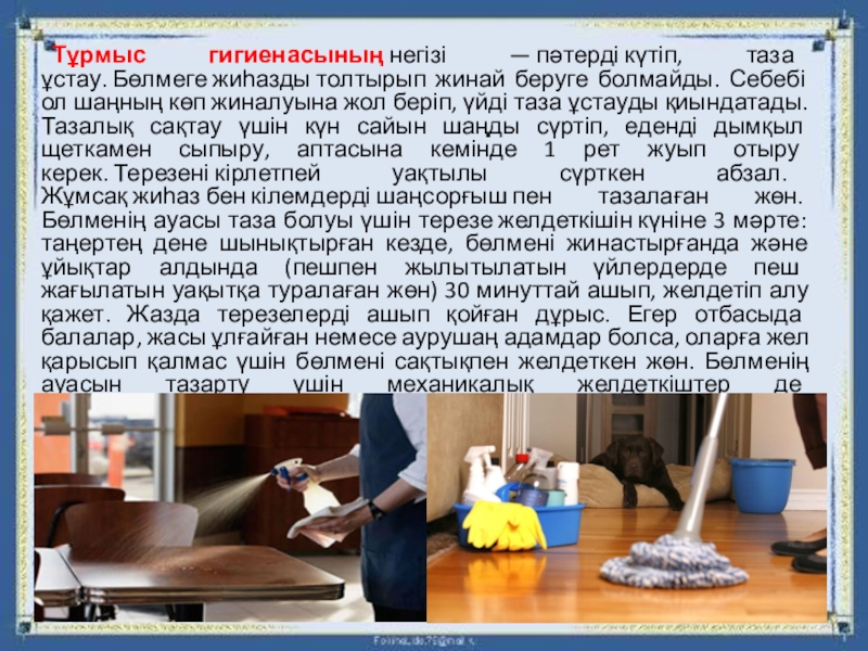 Слайд 16 Тұрмыс гигиенасының негізі — пәтерді күтіп, таза ұстау. Бөлмеге жиһазды толтырып жинай беруге болмайды. Себебі ол шаңның көп жиналуына