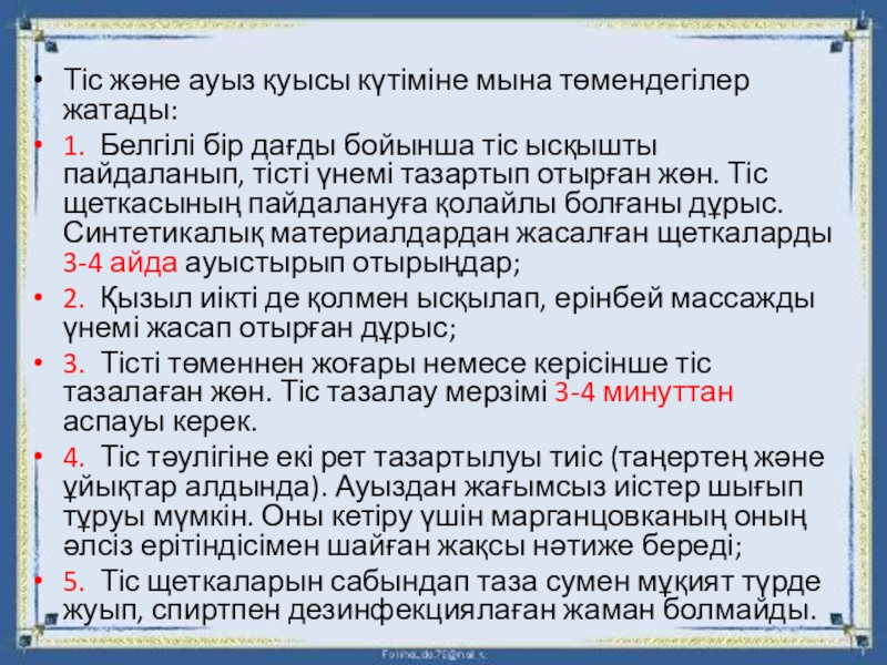 бойынша тіс ысқышты пайдаланып, тісті үнемі тазартып отырған жөн. Тіс щеткасының пайдалануға қолайлы болғаны дұрыс. Синтетикалық материалдардан жасалған щеткаларды 3-4 айда ауыстырып отырыңдар;