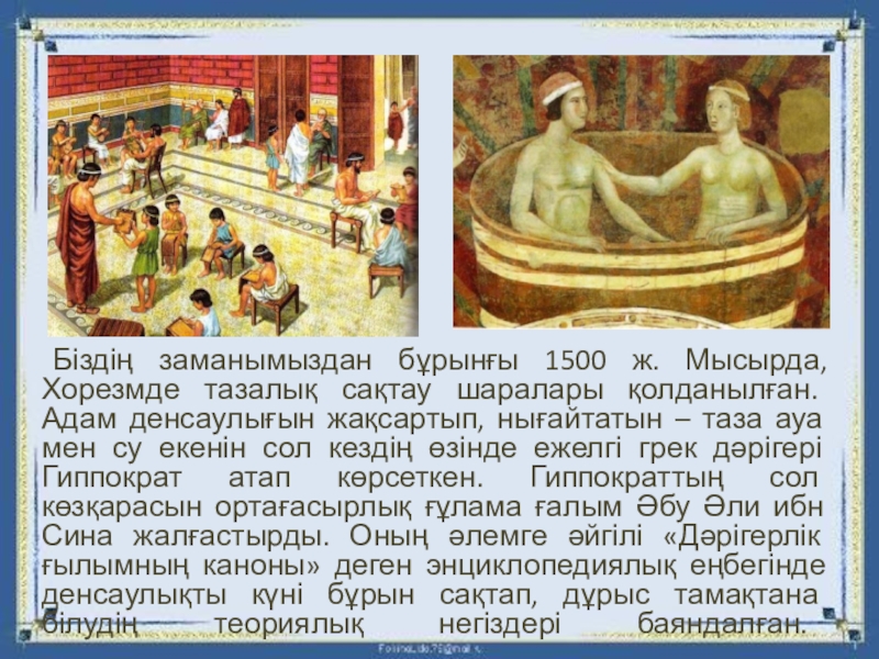 Слайд 4 Біздің заманымыздан бұрынғы 1500 ж. Мысырда,Хорезмде тазалық сақтау шаралары қолданылған. Адам
