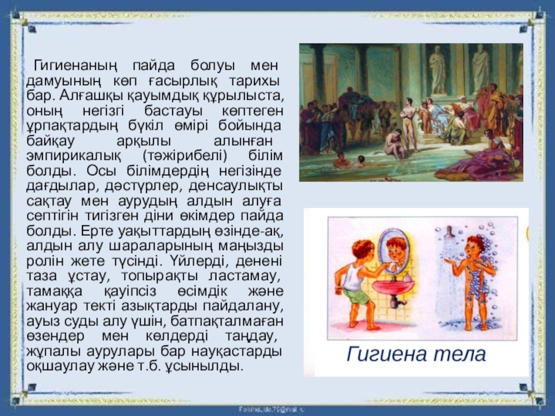Слайд 5 Гигиенаның пайда болуы мен дамуының көп ғасырлық тарихы бар. Алғашқы