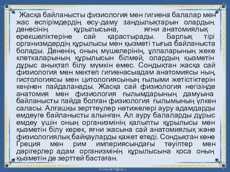 Слайд 18 Жасқа байланысты физиология мен гигиена балалар мен жас өспірімдердің өсу-даму заңдылықтарын