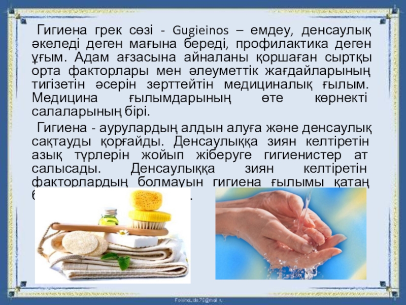 Слайд 3 Гигиена грек сөзі - Gugieinos – емдеу, денсаулық әкеледі деген мағына