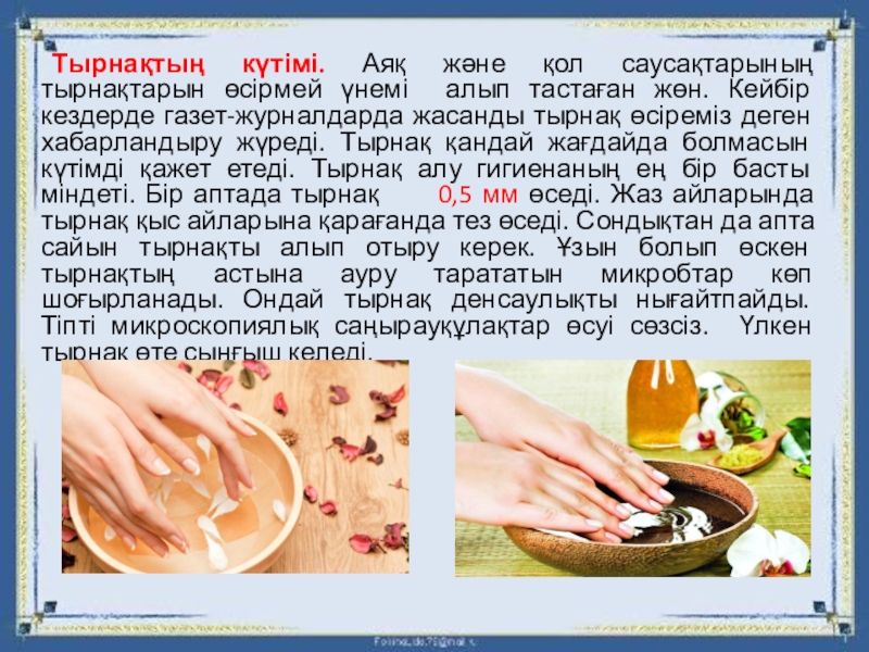Слайд 9 Тырнақтың күтімі. Аяқ және қол саусақтарының тырнақтарын өсірмей үнемі алып тастаған